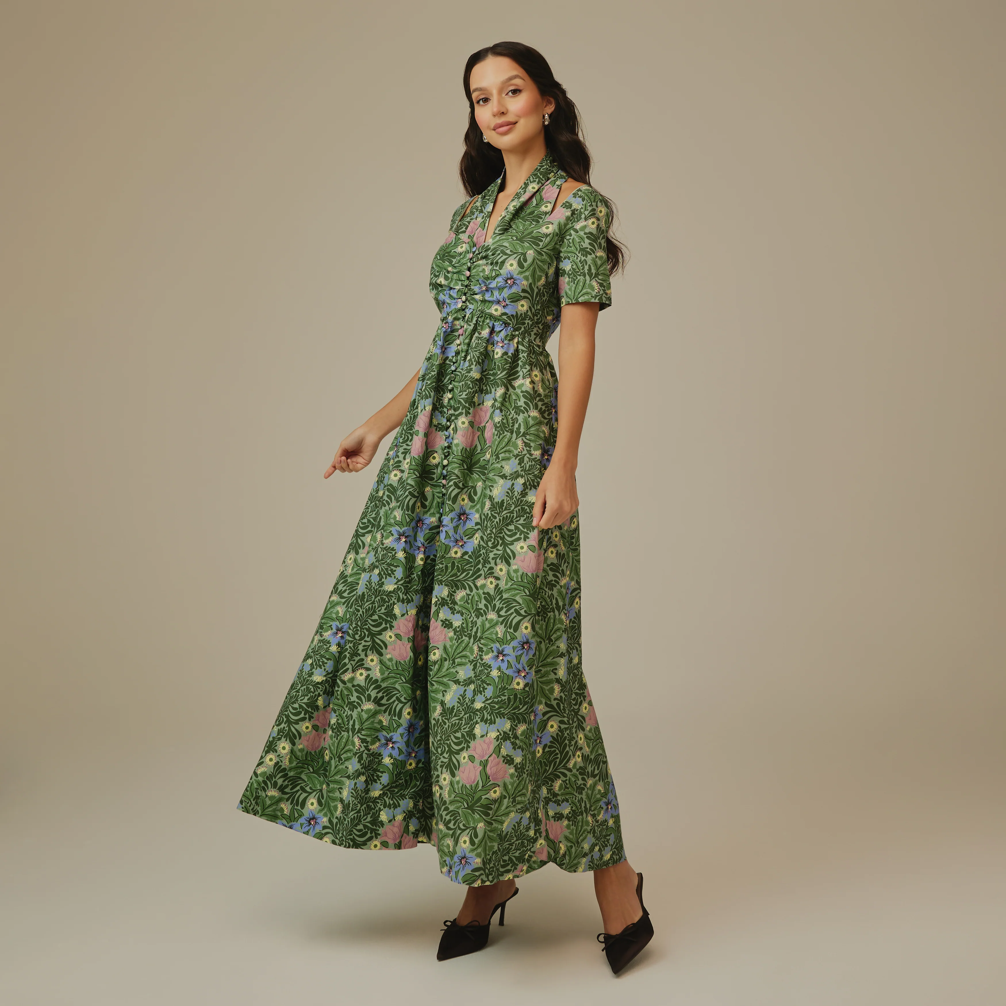 Made from breathable linen, this dress showcases a green base adorned with floral prints in lilac, blue, and yellow tones. The ruched bodice with fabric-covered buttons and halter-inspired neckline flatters the silhouette, while subtle shoulder cut-outs add a modern twist. A side pockets is there for everyday practicality. A perfect blend of comfort and elegance for fall days and relaxed evenings.
