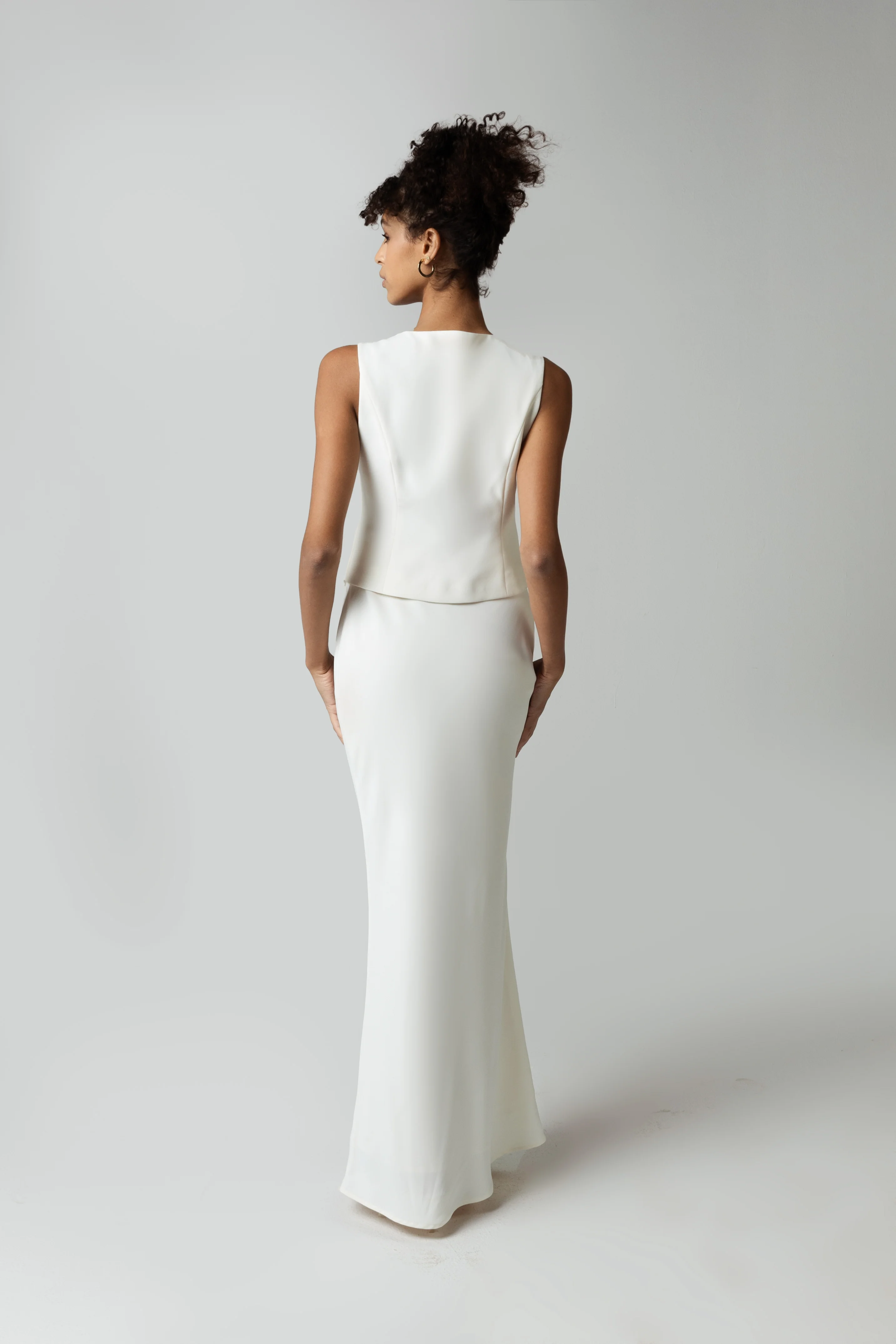 Elevate your wardrobe with this white crepe co-ord maxi skirt, featuring a flattering bias-cut design for a graceful silhouette.