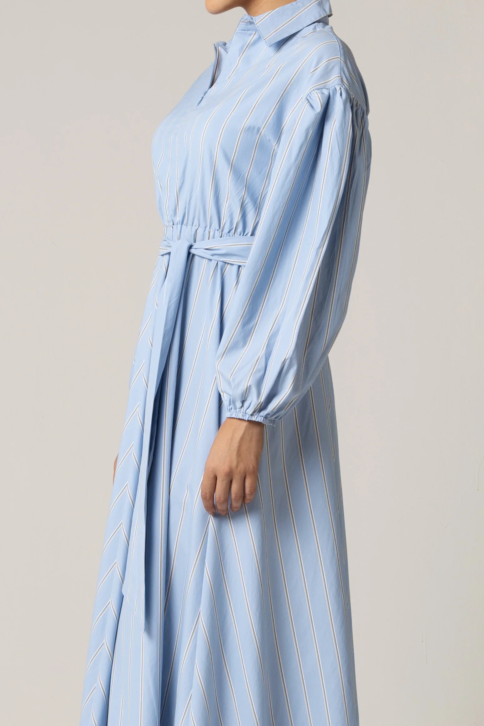 Blue with Tie Belt and Elastic Wristband Dress