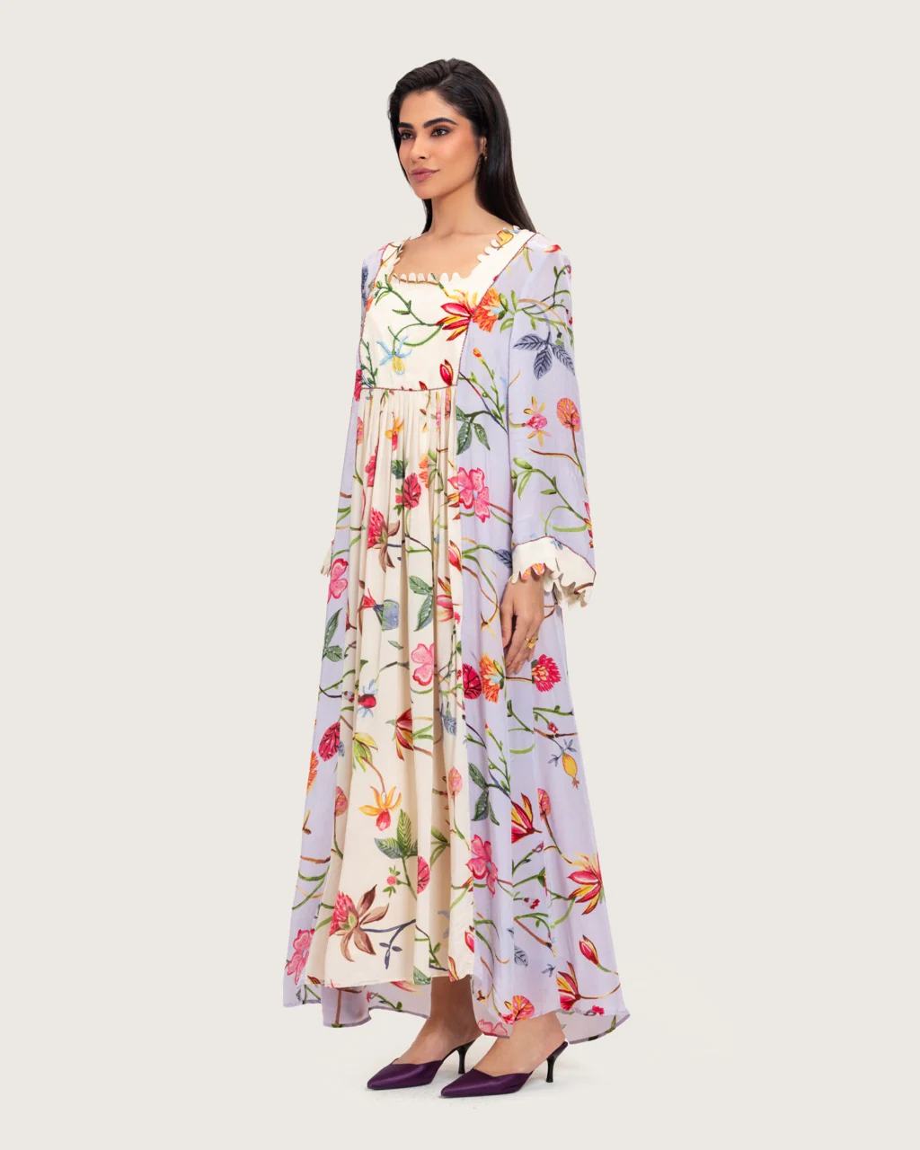 A romantic floral maxi dress elevated with delicate beaded embroidery on the bodice, adding a refined and elegant touch. Designed in a relaxed, flowy silhouette with a soft scalloped square neckline and lightweight long sleeves, it drapes beautifully on the body. Crafted from lightweight printed chiffon-satin like fabric, it features a light feel, ankle-length cut, and effortless comfort.