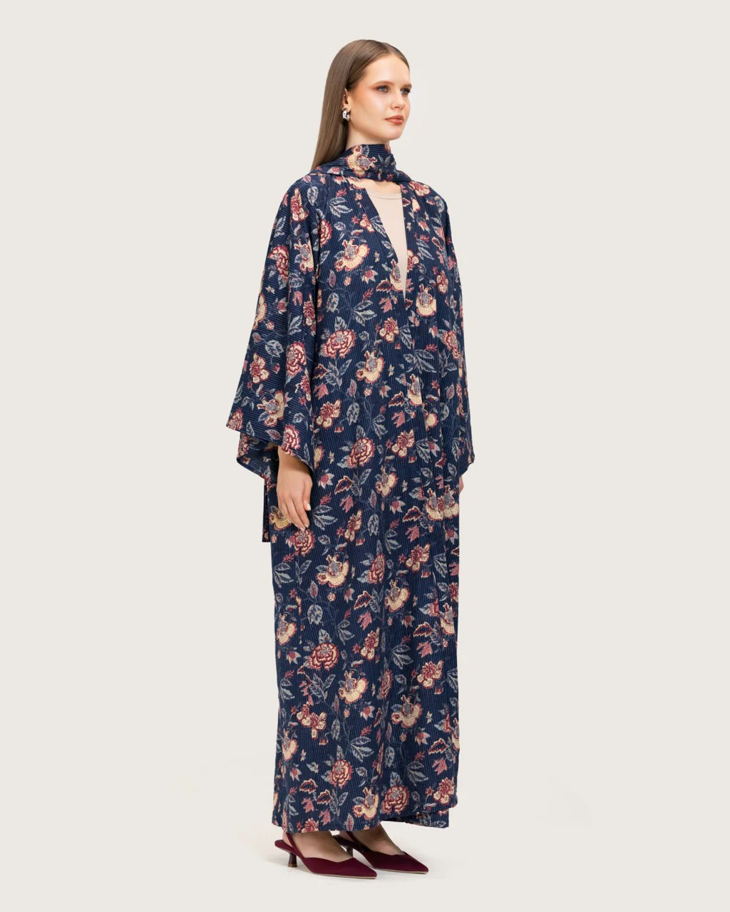 Cotton Abaya featuring a classic floral print on a deep navy base. This piece is ideal for warm and transitional weather. The straight, relaxed silhouette with wide sleeves offers comfort and sophistication. Its medium-light weight makes it perfect for long every day wear. Ideal for Ramadan gatherings, family events, outings, or elegant daywear, this dress stands out for its versatility. Wear it open as an abaya with scarf on neck or with an underdress and flat sandals for daytime, or add a belt to redefine the silhouette.
