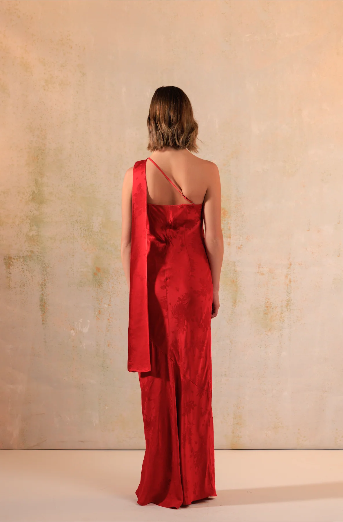 Red Satin Jacquard One-Shoulder Maxi Bias Cut Dress
