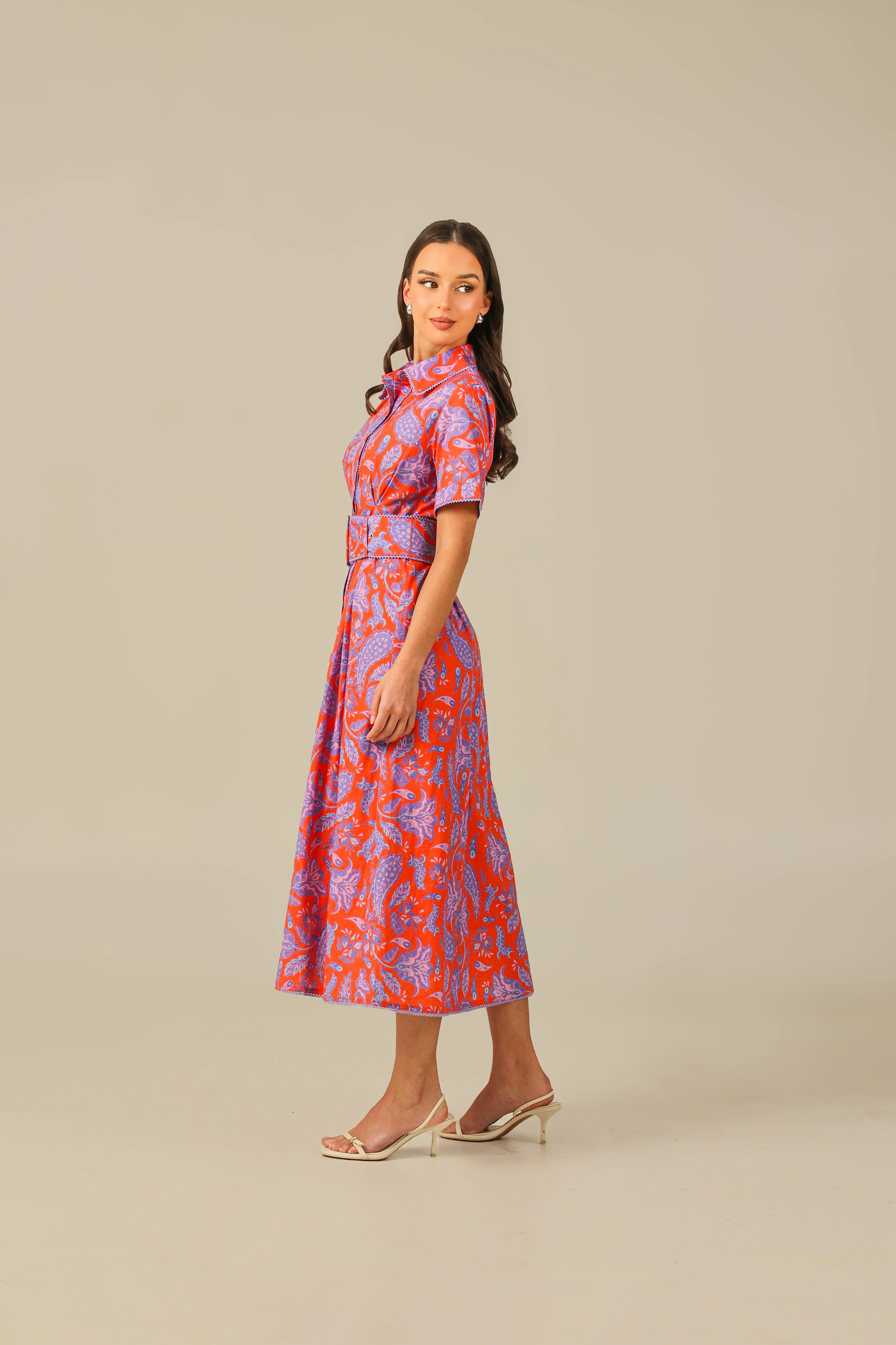 This striking dress is crafted from breathable linen and features a bold, colorful print in vibrant shades of red and purple. The structured silhouette includes a classic shirt collar, short sleeves, and a flattering midi length. Thoughtful details like delicate crochet trims add a subtle artisanal touch, while the matching self-fabric belt cinches the waist to create a beautifully defined shape. Equal parts playful and polished, this dress is perfect for daytime events or chic summer outings.