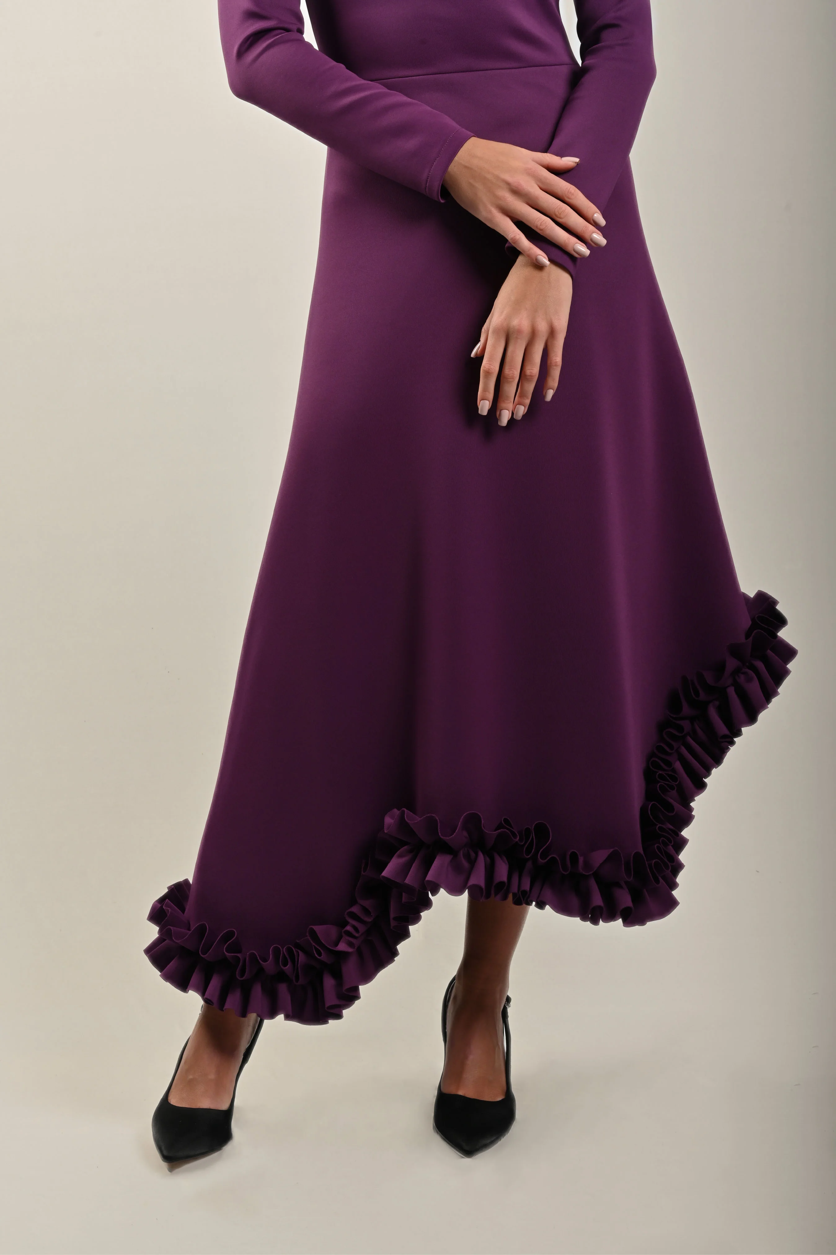 Add a playful touch to your wardrobe with this purple dress, featuring long sleeves and a ruffled hem for versatile elegance.