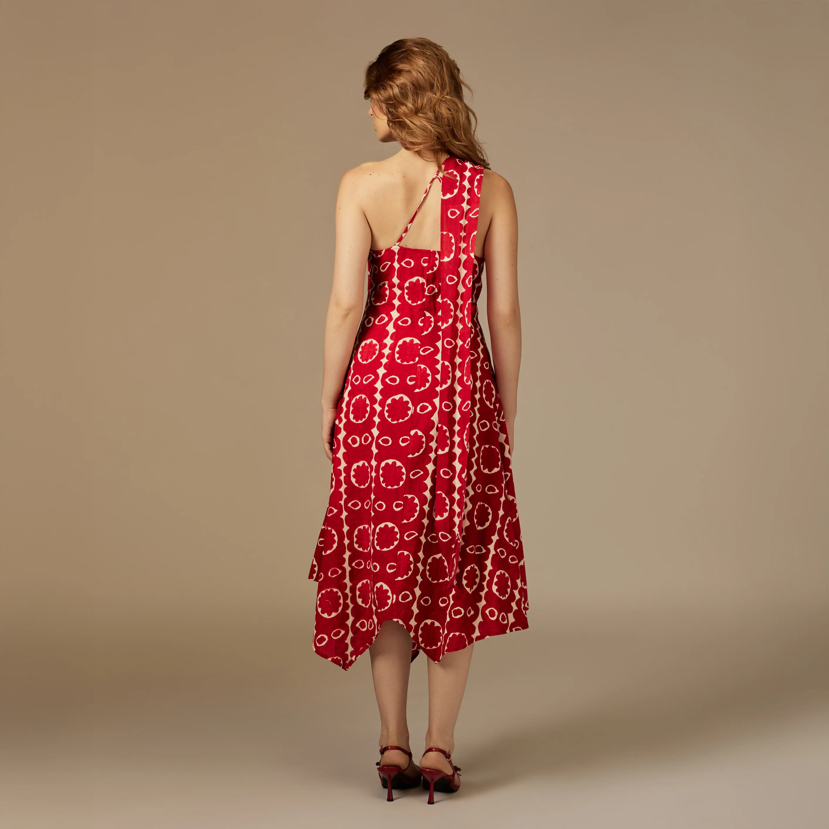 This striking asymmetrical linen dress features a vibrant red hue adorned with playful patterns. The lightweight linen fabric drapes effortlessly, ensuring comfort while maintaining an eye-catching silhouette. The unique one-shoulder design adds a contemporary twist, perfect for both casual outings and special occasions. It’s a standout piece for any wardrobe.