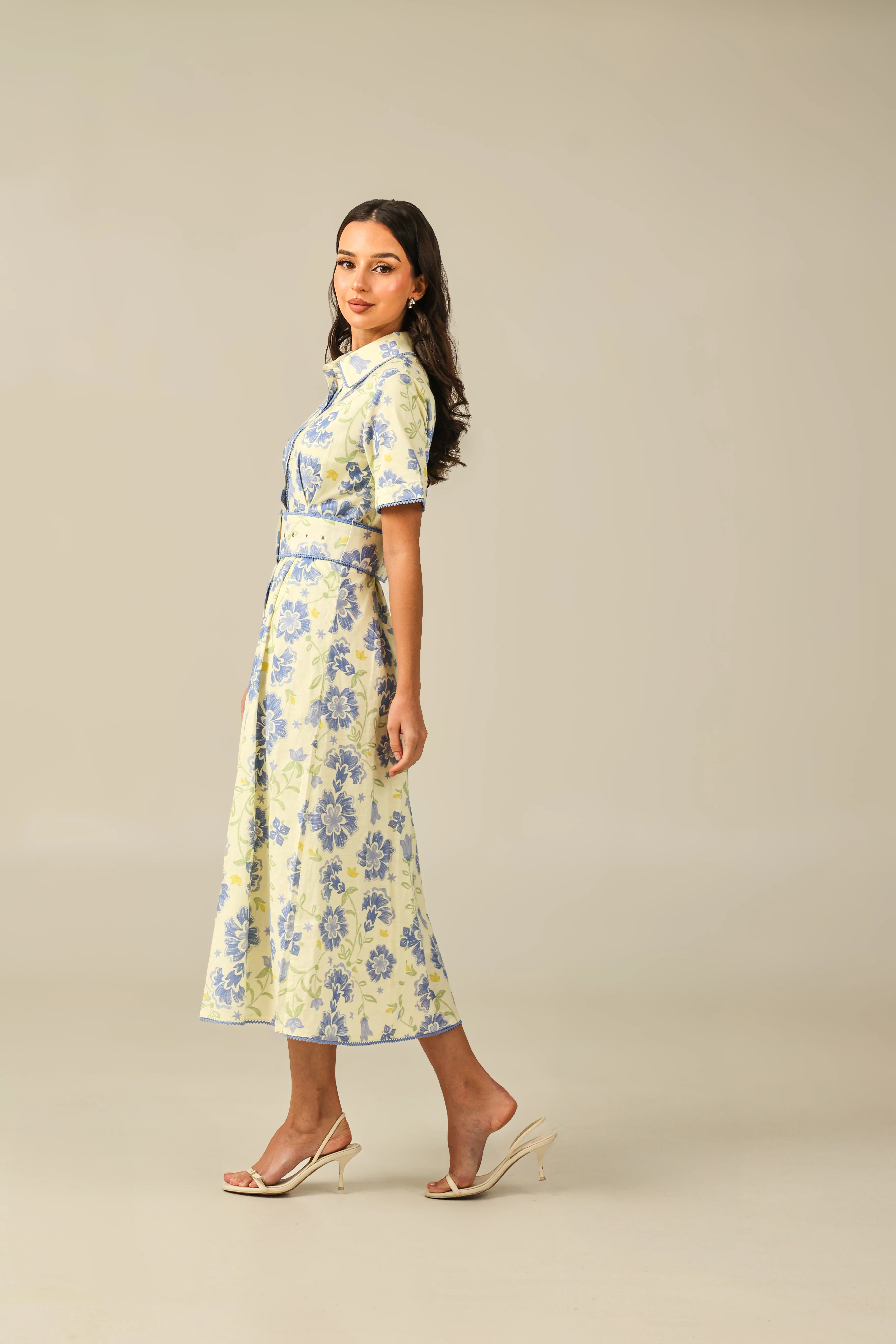 This dress is a graceful blend of classic charm and refined detail. Crafted from breathable printed linen, it features a delicate floral pattern in soft shades of blue and green. The silhouette is tailored with a structured shirt collar, button-down front, and short sleeves, offering a polished yet effortless look. Crochet trims subtly accent the design, adding a touch of artisanal elegance, while the matching self-fabric belt cinches the waist for a flattering, feminine shape. Perfect for daytime occasions or garden gatherings, this dress embodies timeless sophistication with a light, airy feel.