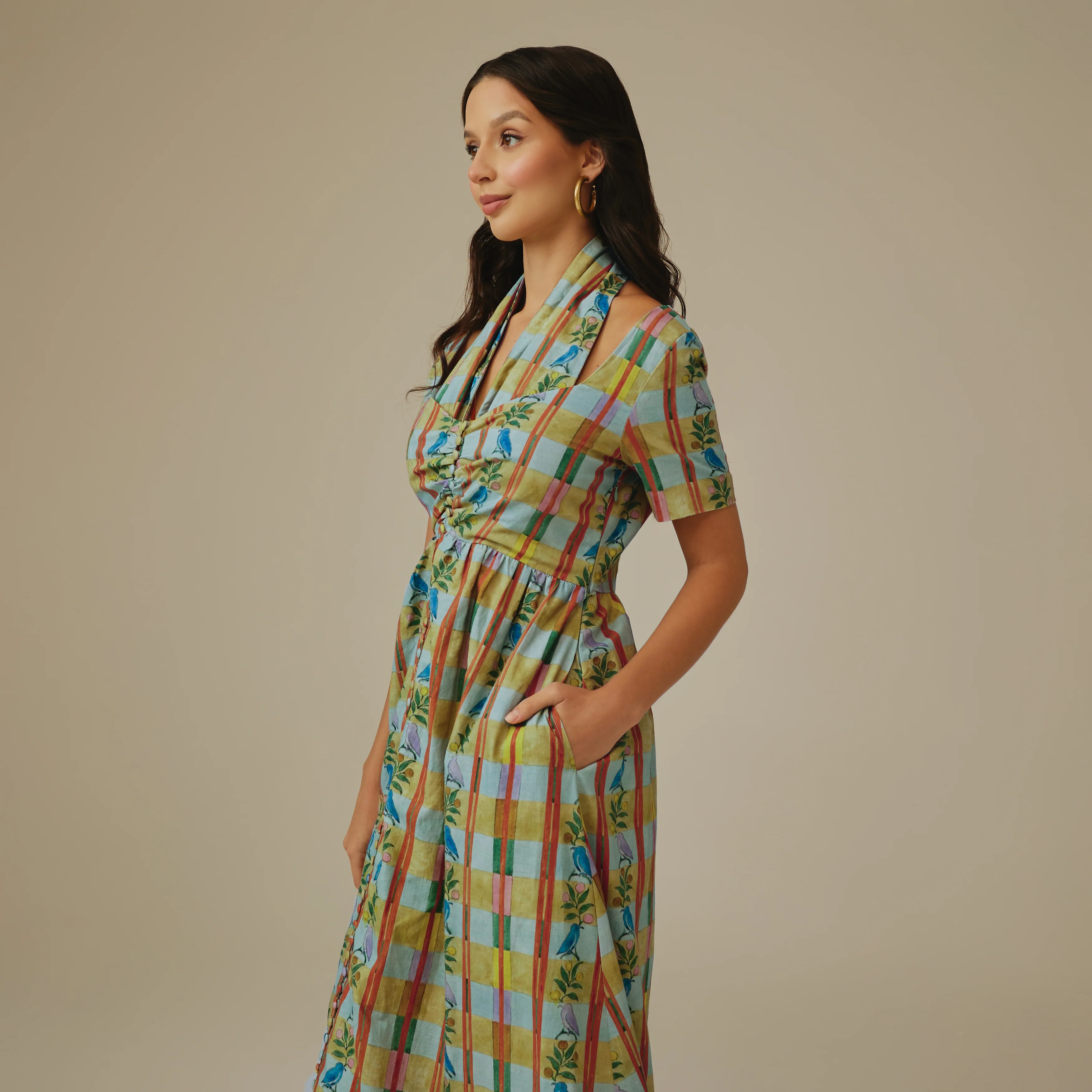 Crafted from breathable linen, this maxi dress blends modern checks with delicate embroidered florals. Designed with a ruched bust and halter-inspired neckline, it flatters the silhouette while offering all-day comfort. The flowing skirt creates effortless movement, and practical side pockets add functionality.
