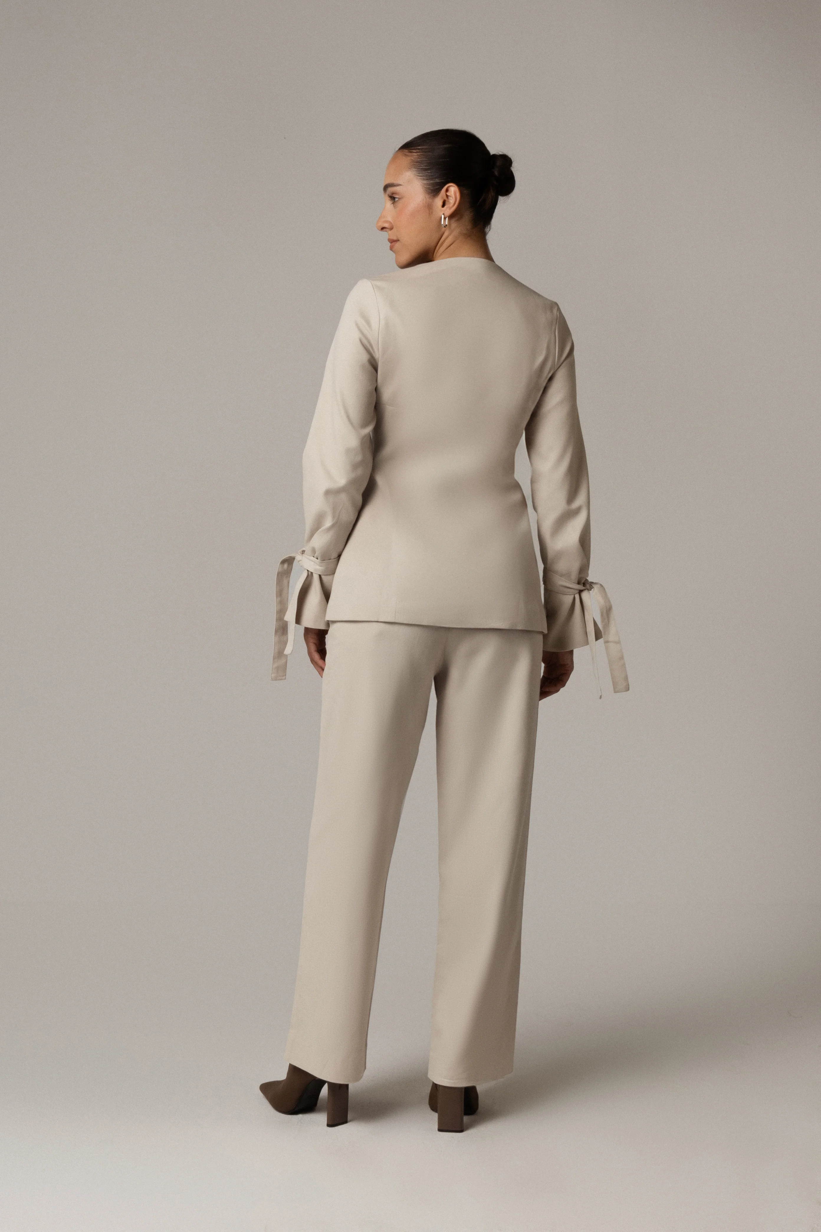 Perfect for the office or any special occasion, this chic twill grey suit set features tie wristbands and a unique neckline shape making it modern and chic at the same time. Elevate your wardrobe with this versatile piece that combines fashion-forward design with a timeless appeal!