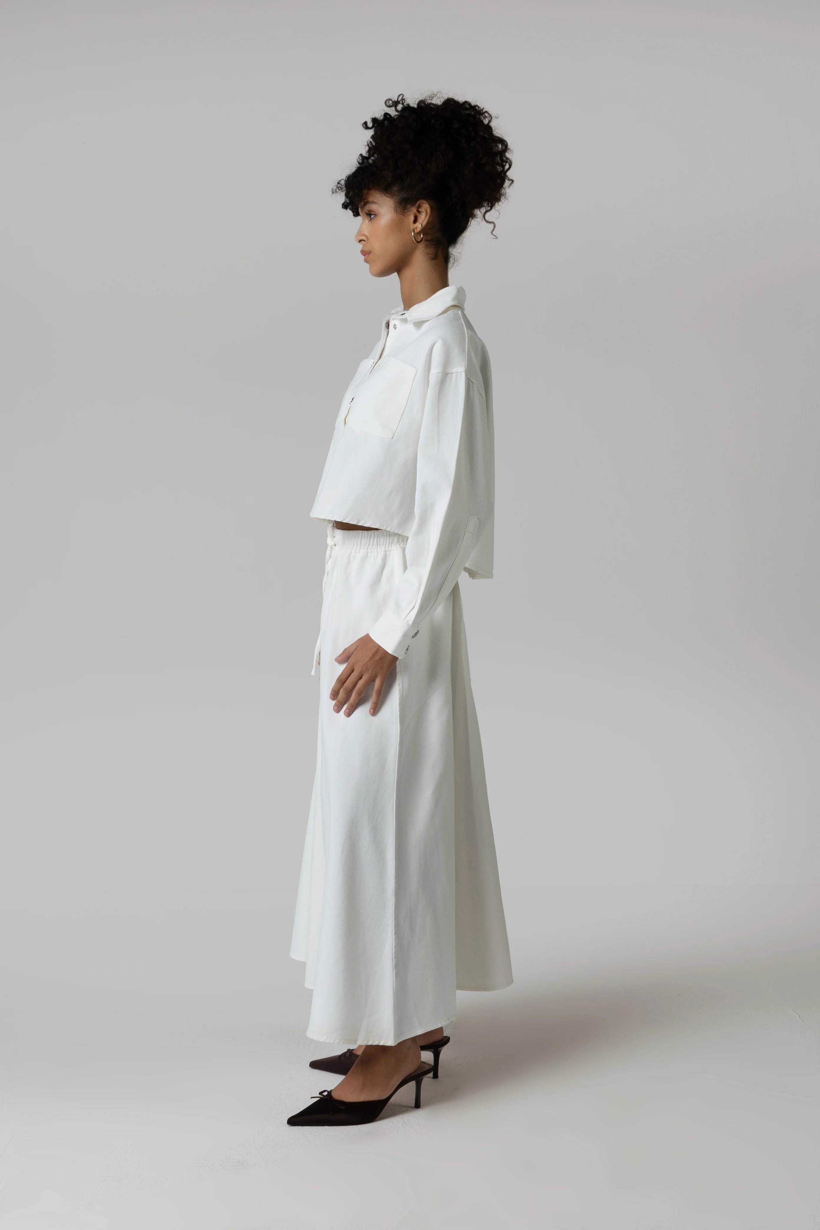 Embrace a blend of style and practicality with this chic twill coord shirt and A-line skirt duo. The shirt features metallic buttons that elevate its classic design, while the A-line skirt includes drawstrings for a customizable fit and a hint of playful flair.